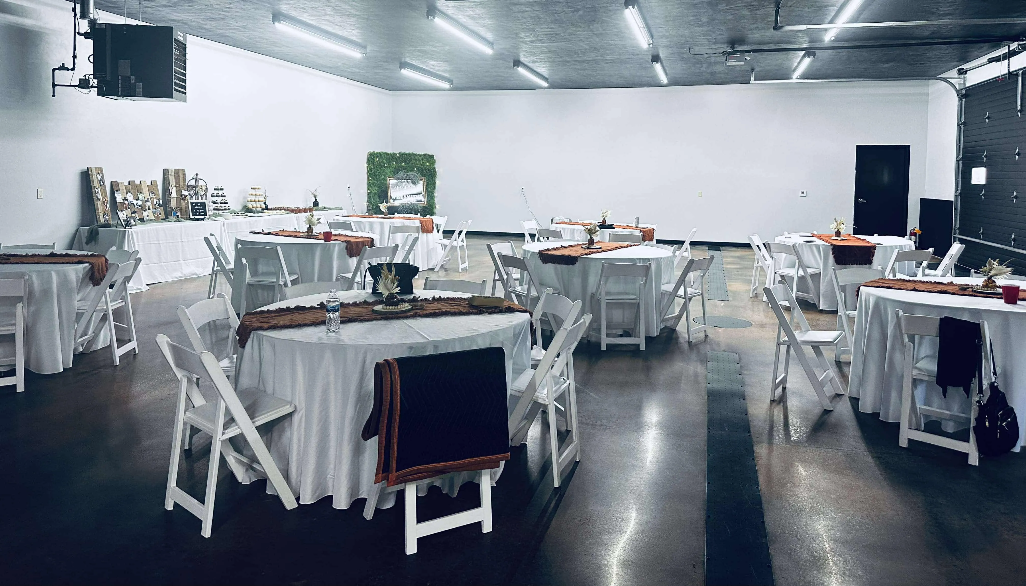 Features: Spacious, newly renovated, adaptable area suitable for a wide range of setups for classroom style, networking, small/large group gathering. Indoor/Outdoor with 3 10’ garage doors. Temperature controlled. Rolling Bar. ADA Accessible. Tons of natural lighting. Tables, chairs, linens, decorations, marketing, and more are all available.